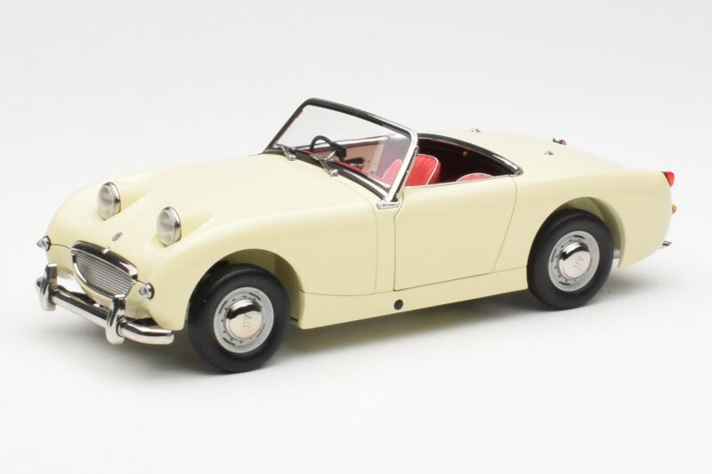 The Austin-Healey Sprite Mk I Open Old English Weiß Kyosho 1:18 is crafted from Druckguss. Die-cast zinc alloy body with detailed plastic parts, rubber tires, and high-quality paint finish. Die-cast models are known for their weight, durability, and realistic feel.