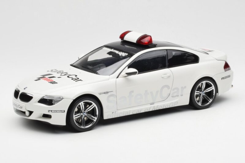 The BMW M6 E63 MotoGP Safety Car 2006 Kyosho 1:18 is crafted from Druckguss. Die-cast zinc alloy body with detailed plastic parts, rubber tires, and high-quality paint finish. Die-cast models are known for their weight, durability, and realistic feel.