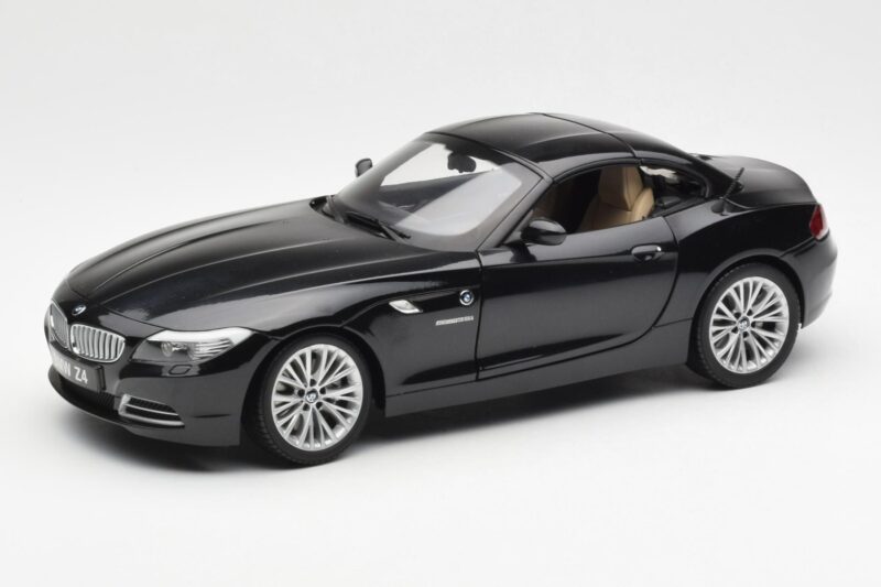 The BMW Z4 E89 Spider Schwarz Metallic Kyosho 1:18 is crafted from Druckguss. Die-cast zinc alloy body with detailed plastic parts, rubber tires, and high-quality paint finish. Die-cast models are known for their weight, durability, and realistic feel.