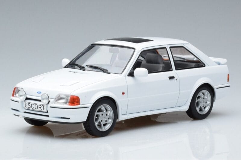 The Ford Escort Mk4 RS Turbo S Weiß MCG 1:18 is crafted from Druckguss. Die-cast zinc alloy body with detailed plastic parts, rubber tires, and high-quality paint finish. Die-cast models are known for their weight, durability, and realistic feel.