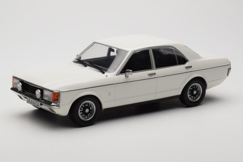 The Ford Granada Mk1 Weiß MCG 1:18 is crafted from Druckguss. Die-cast zinc alloy body with detailed plastic parts, rubber tires, and high-quality paint finish. Die-cast models are known for their weight, durability, and realistic feel.