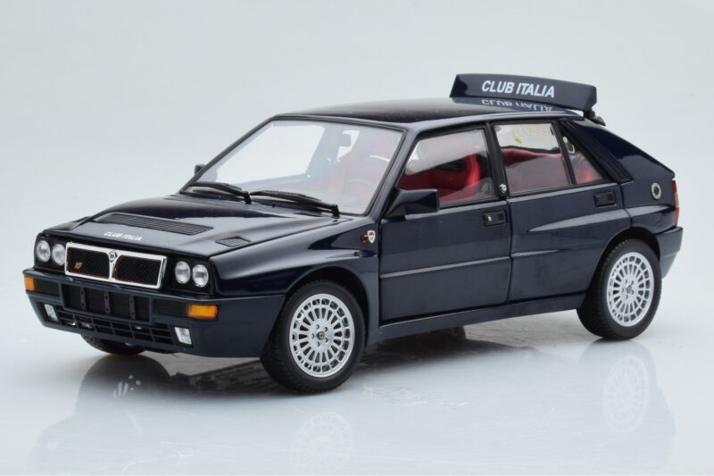 The Lancia Delta HF Integrale Club Italia Blau Kyosho 1:18 is crafted from Druckguss. Die-cast zinc alloy body with detailed plastic parts, rubber tires, and high-quality paint finish. Die-cast models are known for their weight, durability, and realistic feel.