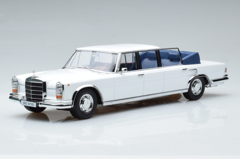 The Mercedes 600 Pullman W100 Landaulet Weiß KK-Scale 1:18 is crafted from Druckguss. Die-cast zinc alloy body with detailed plastic parts, rubber tires, and high-quality paint finish. Die-cast models are known for their weight, durability, and realistic feel.
