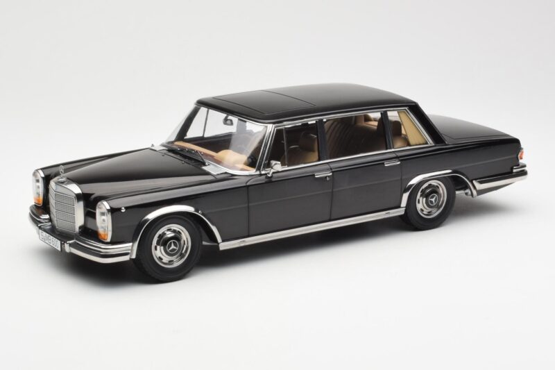 The Mercedes 600 SWB W100 Schwarz KK-Scale 1:18 is crafted from Druckguss. Die-cast zinc alloy body with detailed plastic parts, rubber tires, and high-quality paint finish. Die-cast models are known for their weight, durability, and realistic feel.