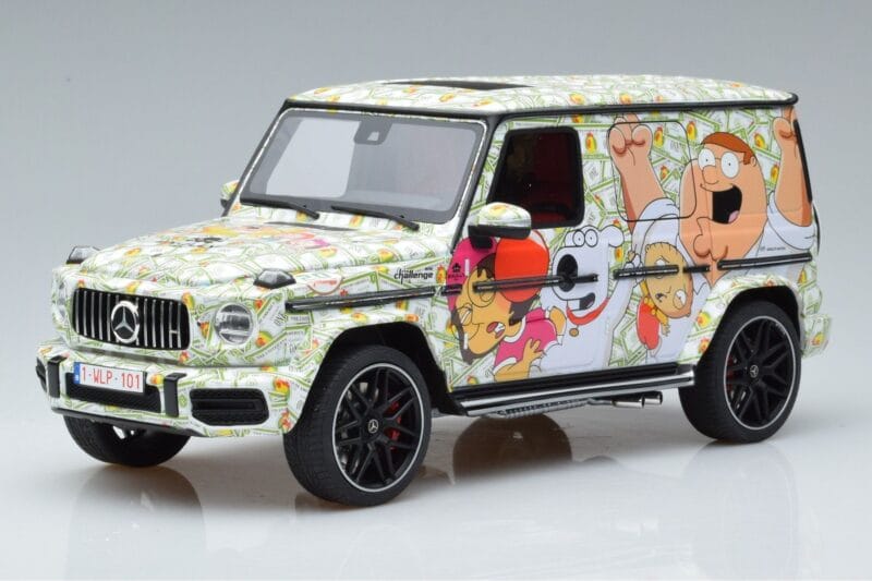 The Mercedes AMG G63 W463 Family Guy GT Spirit 1:18 is crafted from Druckguss. Die-cast zinc alloy body with detailed plastic parts, rubber tires, and high-quality paint finish. Die-cast models are known for their weight, durability, and realistic feel.