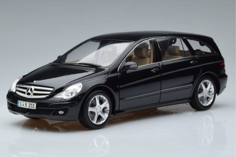 The Mercedes R-Class W251 Obsidian Schwarz Minichamps 1:18 is crafted from Druckguss. Die-cast zinc alloy body with detailed plastic parts, rubber tires, and high-quality paint finish. Die-cast models are known for their weight, durability, and realistic feel.