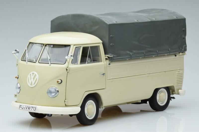 The Volkswagen T1b Pickup Schuco 1:18 is crafted from Druckguss. Die-cast zinc alloy body with detailed plastic parts, rubber tires, and high-quality paint finish. Die-cast models are known for their weight, durability, and realistic feel.