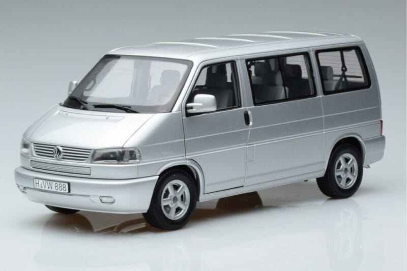 The Volkswagen T4b Transporter Caravelle Minibus Schuco 1:18 is crafted from Druckguss. Die-cast zinc alloy body with detailed plastic parts, rubber tires, and high-quality paint finish. Die-cast models are known for their weight, durability, and realistic feel.